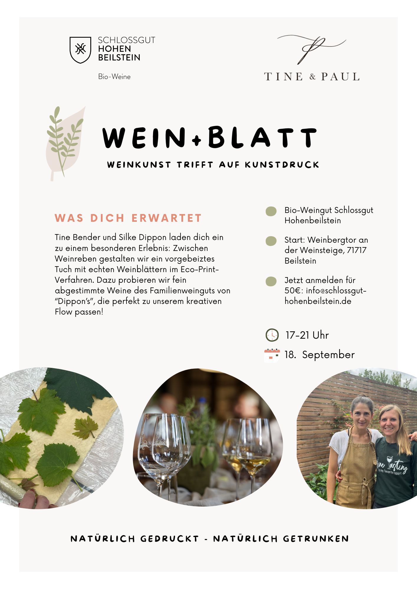 Was dich erwartet: Tine Bender (https://www.tineundpaul.de/) und Silke Dippon laden Dich ein zu einem besonderen Erlebnis: Zwischen Weinreben gestalten wir ein vorgebeiztes Tuch mit echten Weinblättern im Eco-Print-Verfahren. Dazu probieren wir fein abgestimmte Weine unseres Familienweinguts, die perfekt zu unserem kreativen Flow passen! Ganz nach dem Motto "natürlich gedruckt, natürlich getrunken".